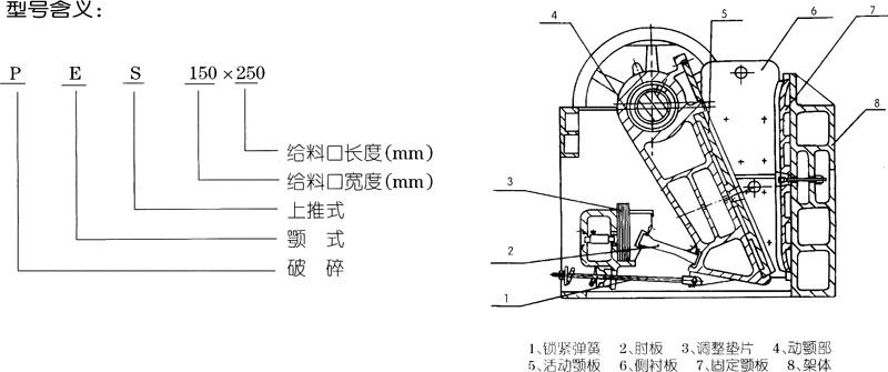 ——顎板、肘板、肘板墊、側(cè)襯板及拉桿彈簧式該破碎機(jī)的易損件,建議用戶儲(chǔ)備。